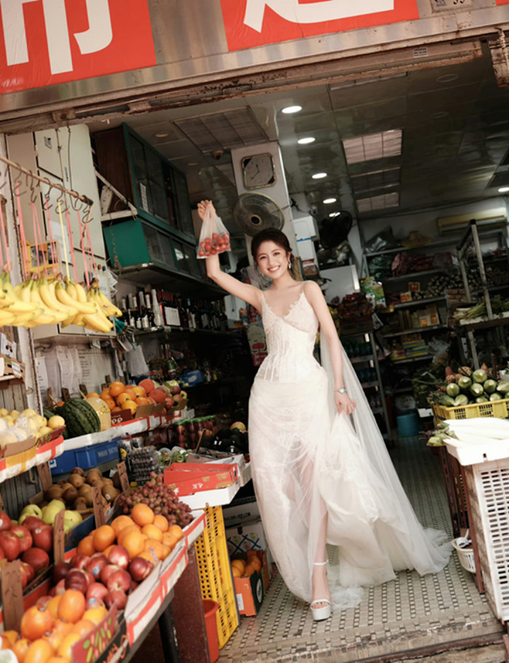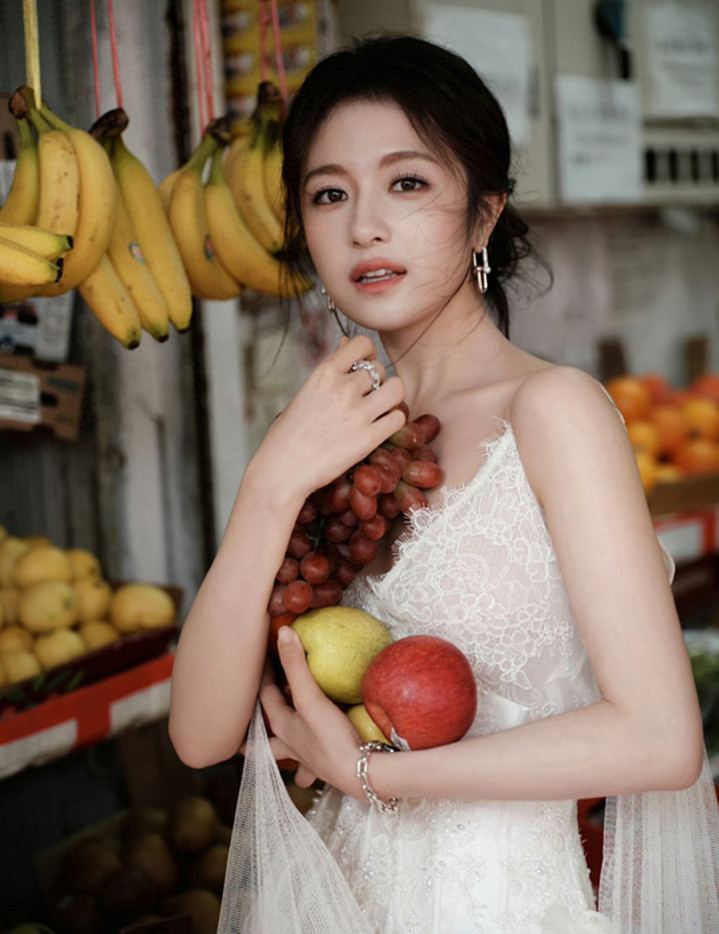 事件发生在12月初,李兰迪在社交平台分享了一组日常随拍,没有团队精心策划,也没有后期过度精修,背景是一处水果摊,道具就是一篮刚采购的应季水果。照片中,她穿着简单的白色礼服,长发随意挽起,手里捧着饱满的苹果,另一张里,提着一串葡萄挡在眼前,阳光透过果皮形成柔和光斑,脸颊的绒毛和眼角的笑纹清晰可见。